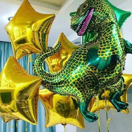 • К разным праздникам часто заказываются тематические композиции. Они выполняются с динозавриками. Для этого аэродизайнерами подбираются шары с рисунками таких существ, фигуры и другие составляющие.